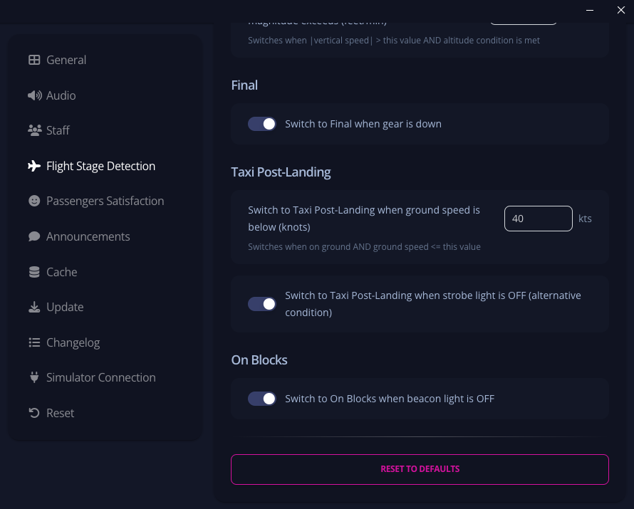 Cabby can automatically change the flight stage for you based on various conditions detected from your simulator. All detection conditions can be previewed and customized in the Settings > Flight Stage Detection page.