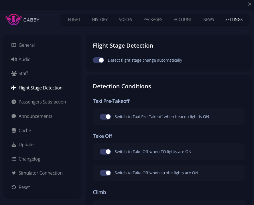 Cabby can automatically change the flight stage for you based on various conditions detected from your simulator. All detection conditions can be previewed and customized in the Settings > Flight Stage Detection page.