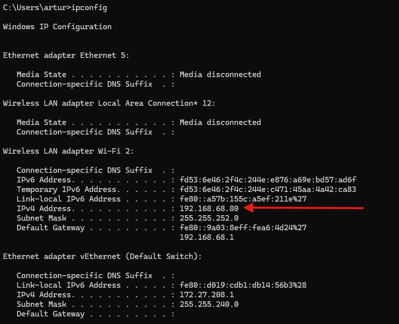 ipconfigand press Enter - Look for "IPv4 Address" under your network adapter