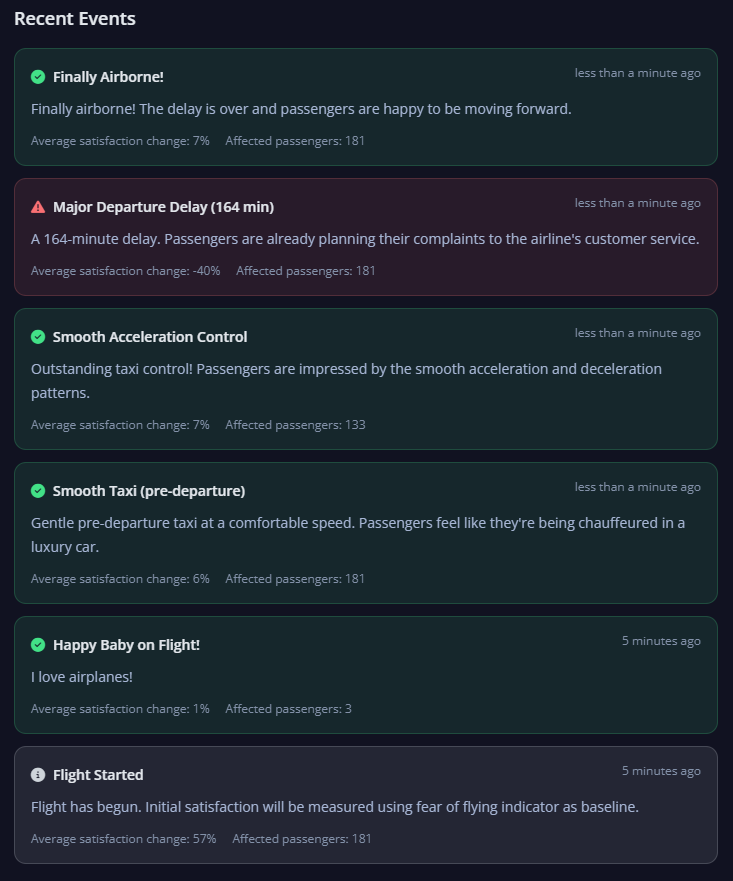 Passenger satisfaction is dynamically calculated based on flight events and their individual fear levels: