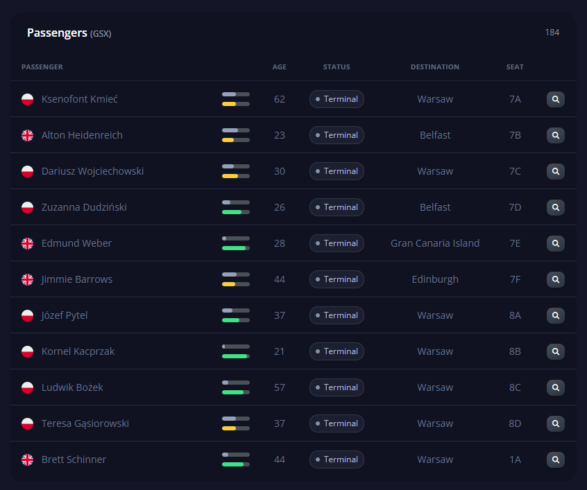 The passengers simulation feature creates a realistic passenger manifest for your flight, complete with individual passenger profiles, emotional states, and detailed flight experiences. This system adds depth and realism to your flight simulation by generating passengers based on real-world data and tracking their reactions to flight events.