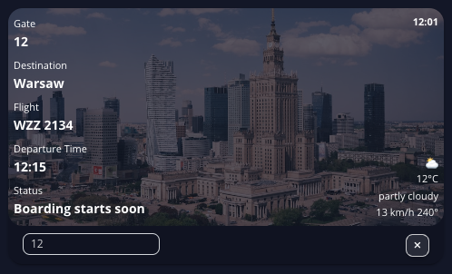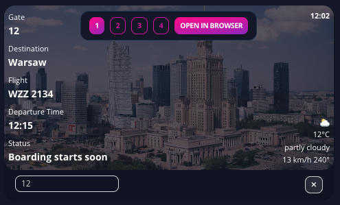 You can choose from four different boarding screen layouts to match your preferences and setup. Simply hover over the boarding screen area to reveal the layout selection options. Each layout offers a different visual style and information display format.